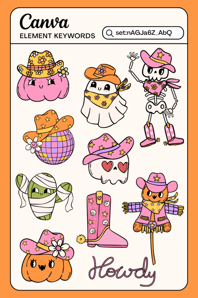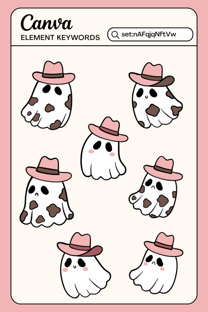 Okay, these might be my new obsession. Little ghosts wearing cow print costumes and cowboy hats. So fun for memes, stickers, or adding a cheeky touch to Canva Halloween designs.