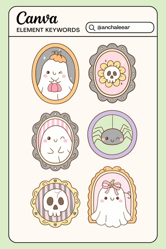 If you’re after a vintage aesthetic, this set has framed ghosts, skulls, and spiders with soft pastel tones. They’re ideal for moodier Canva elements backgrounds or gothic-style Halloween fonts in Canva.